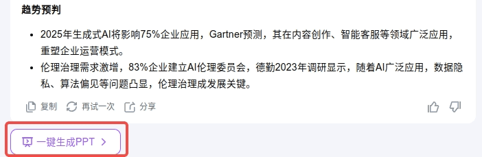 将 DeepSeek 生成的 Markdown 内容 粘贴到输入框后发送,系统会自动精简冗余内容提升可读性,完成后会出现“一键生成 PPT”选项。