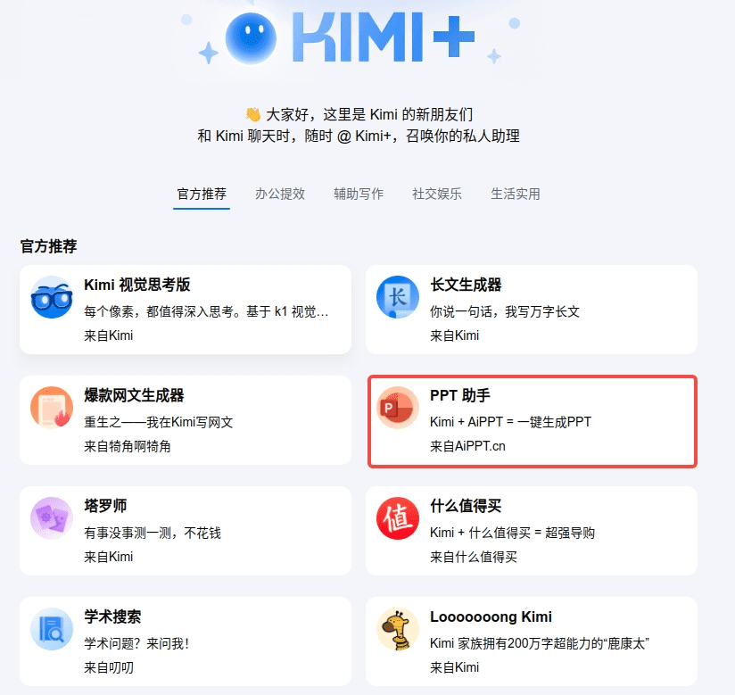 打开 KIMI 官网Kimi.ai – 会推理解析,能深度思考的AI助手并登录,点击左侧菜单栏的“kimi+”,找到“PPT 助手”。