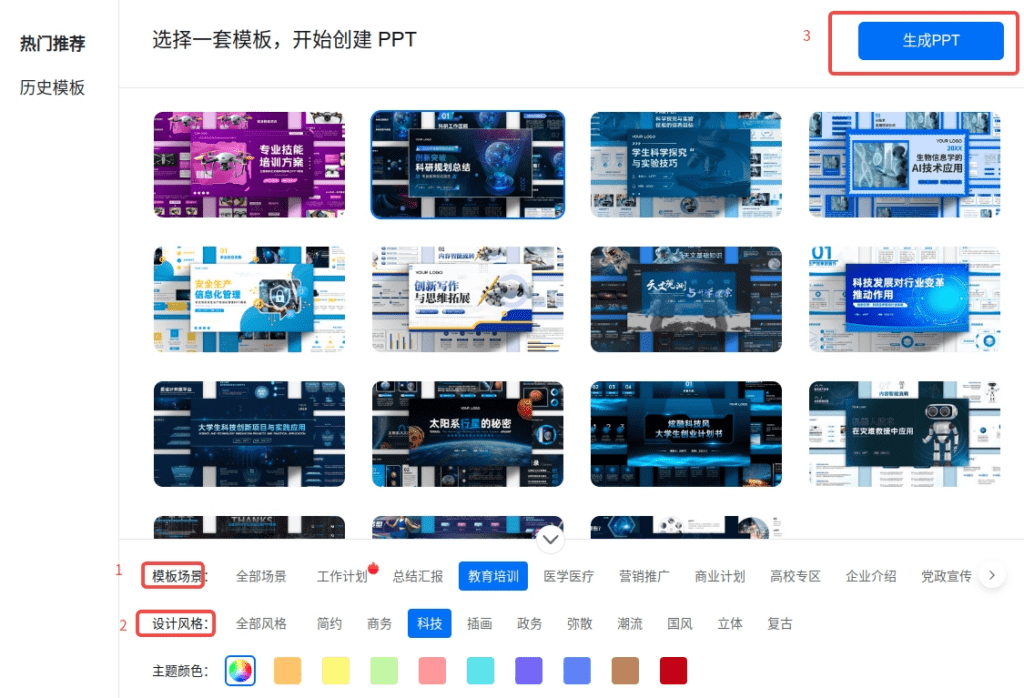 选择风格模板 ,KIMI 的 PPT 助手提供商务、科技、教育等风格。建议使用科技风格。