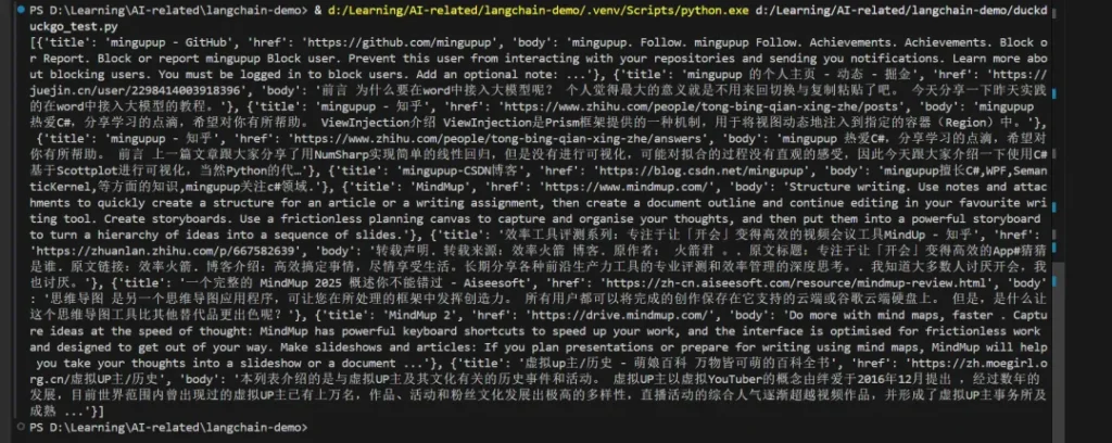 而免费的搜索引擎指的是duckduckgo,可能效果上没有付费的搜索引擎比如必应api与谷歌api好就是了,但是单纯用于测试联网功能的实现那也足够了。