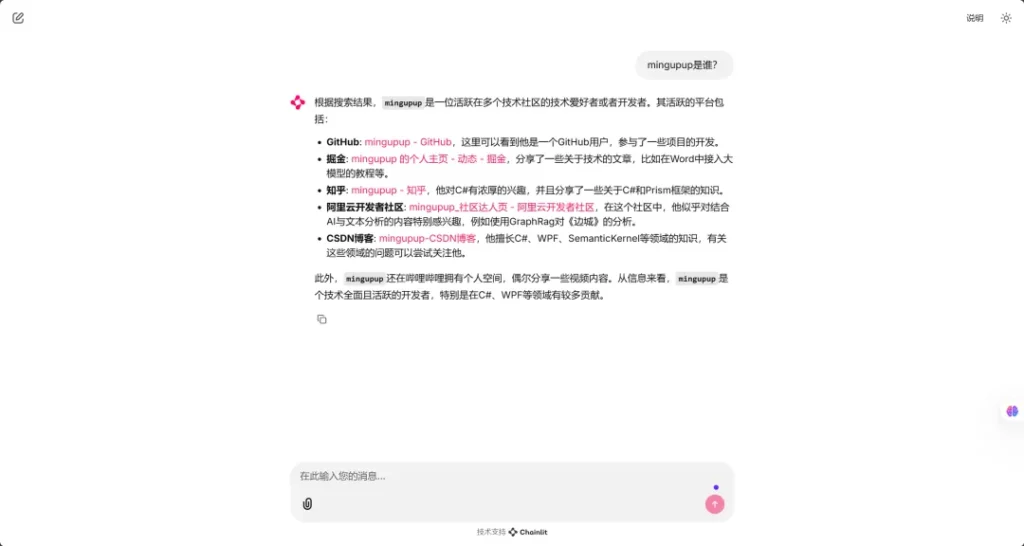 以上就快速实现了简单的联网功能,如果你还想快速创建一个对话应用来测试联网功能,可以使用chainlit: