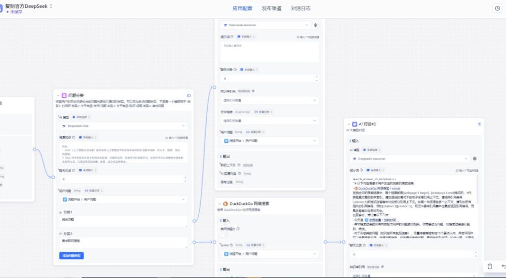 如果是联网问题,走下半部分的流程(先通过DuckDuckGo根据用户问题搜索结果,然后把结果丢给r1节点,并带上官方的R1联网搜索提示词)