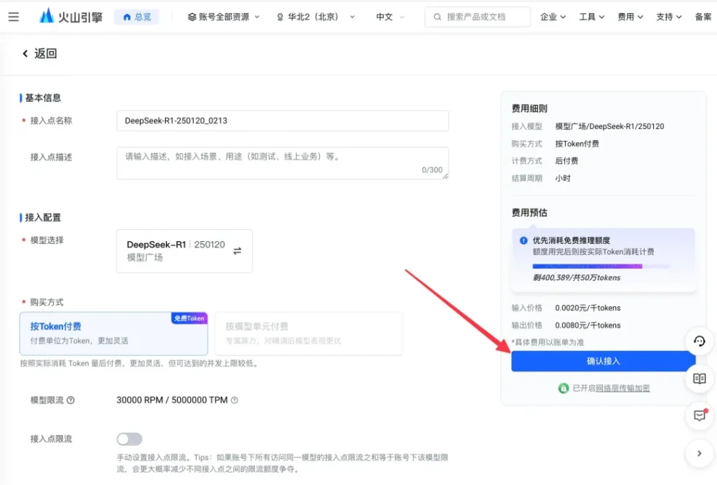 3. 点击之后出现了接入点,也就是 API 创建页面,什么都不用修改,直接点右下角的【确认接入】按钮