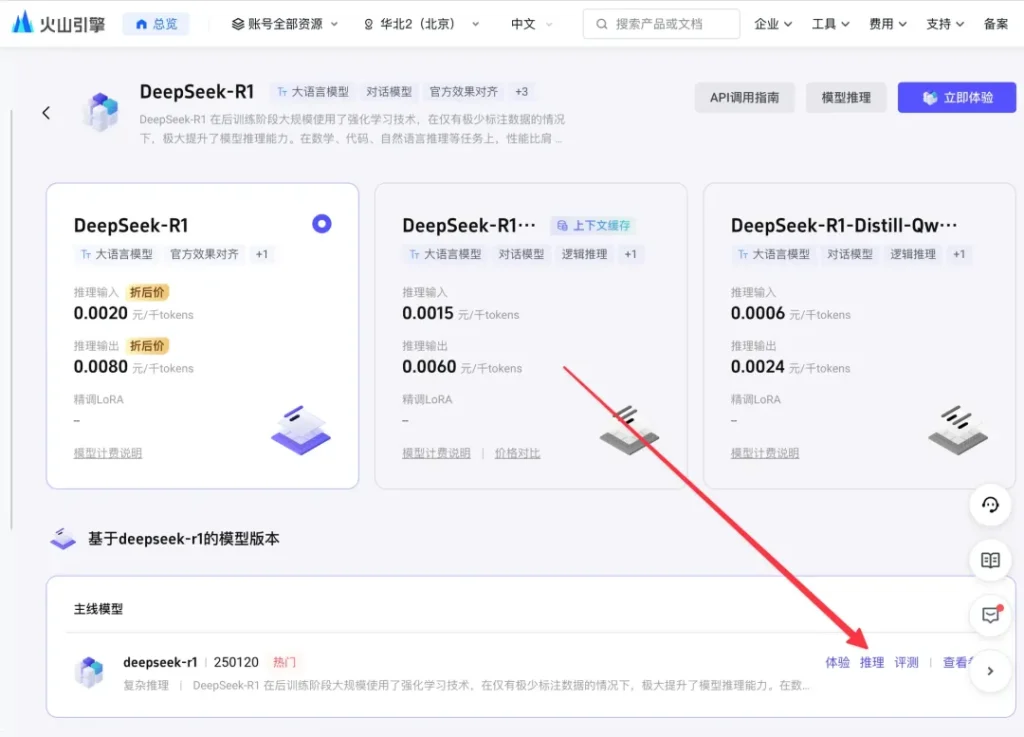 1. 首先打开火山引擎的 DeepSeek R1 模型页面地址:https://console.volcengine.com/ark/region:ark+cn-beijing/model/detail?Id=deepseek-r1