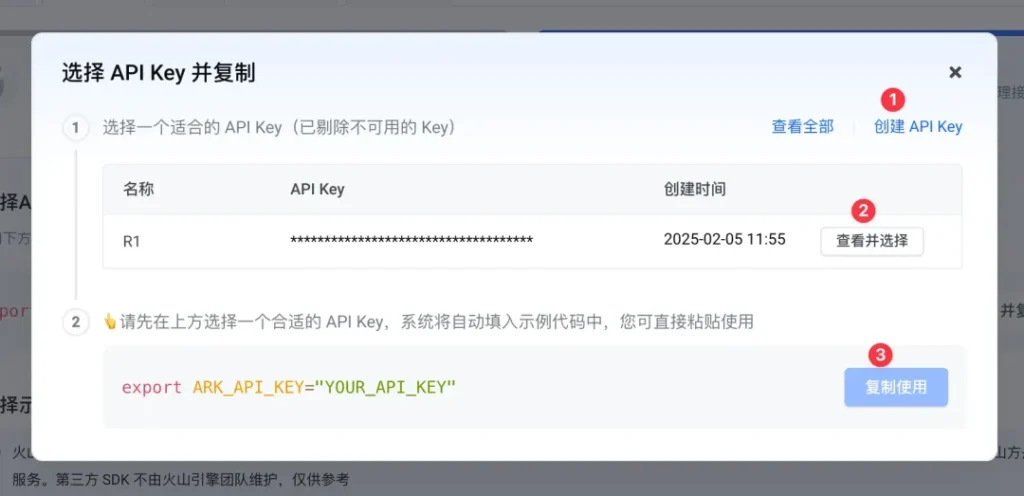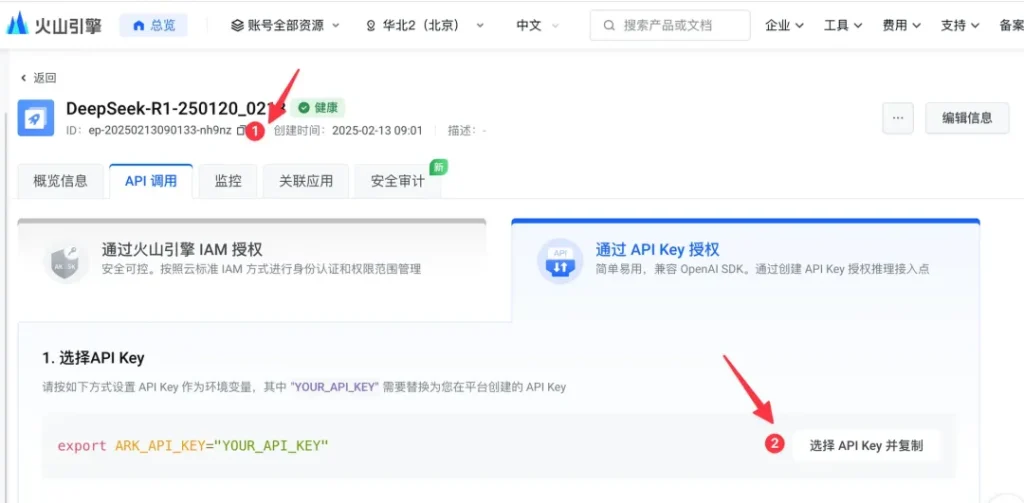现在,我们就拿到了火山云 R1 模型的 ID 和 API Key。