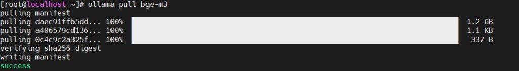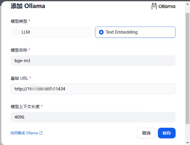 设置——模型供应商——ollama——添加模型:模型选择嵌入模型,模型名称:bge-m3,基础URL填写ollama地址,其他参数默认。