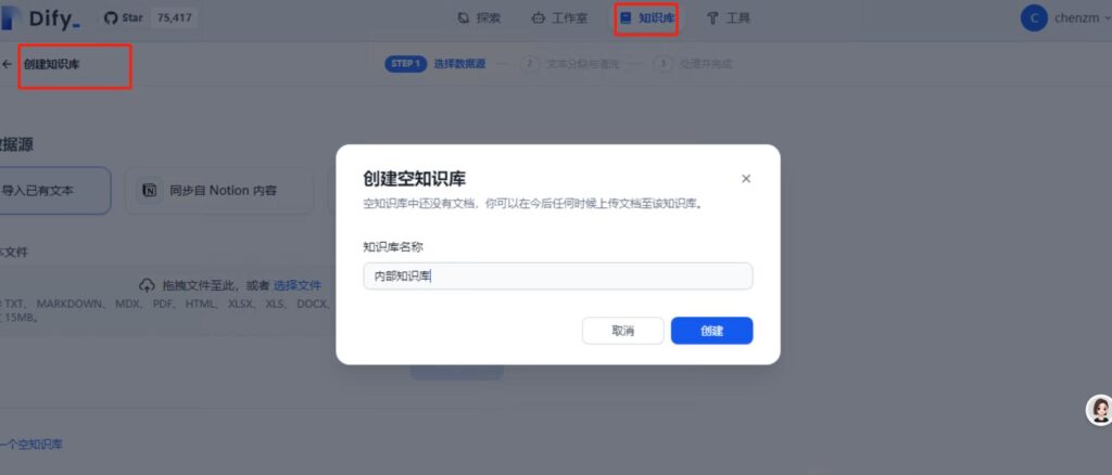 知识库——创建知识库——创建一个空的知识库——输入名称——创建