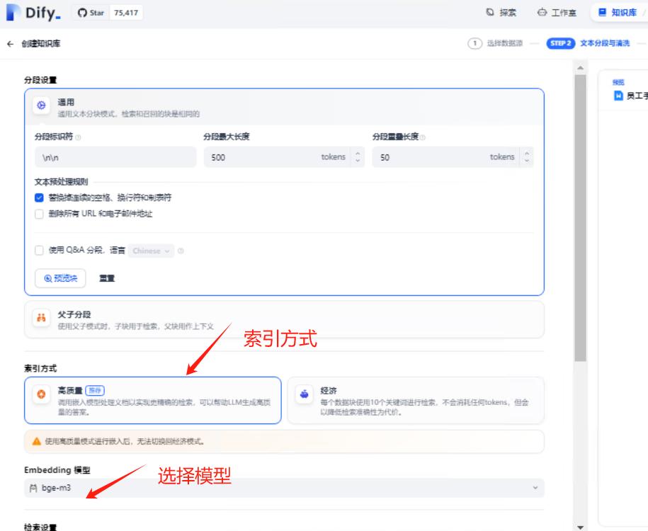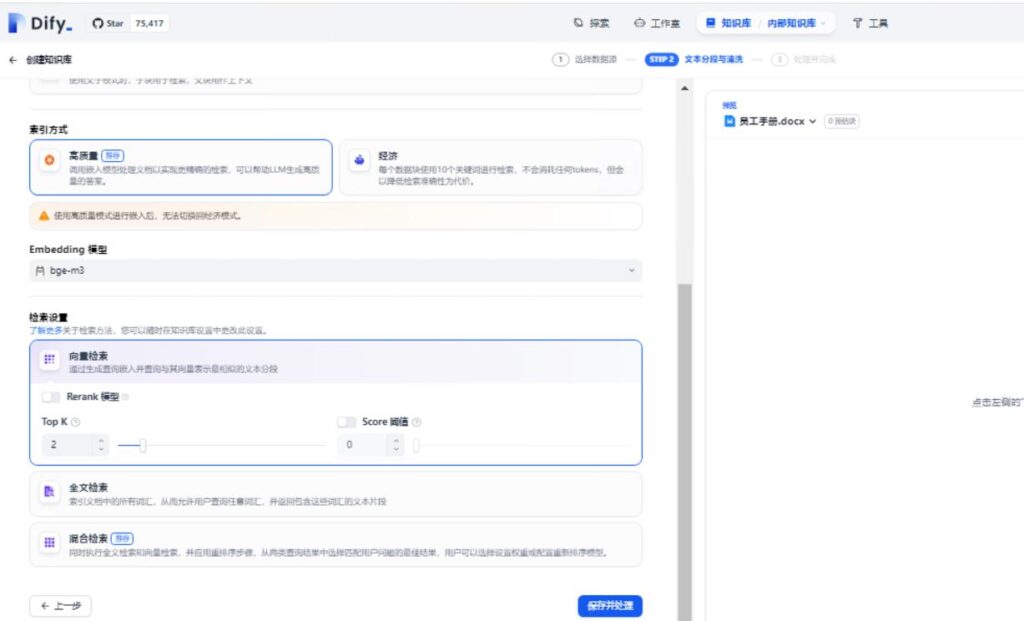 选择索引方式:高质量,选择嵌入模型:bge-m3