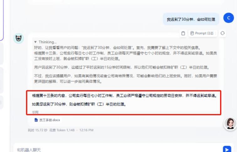 问题1:我迟到了30分钟,会入如何处理,对比手册可以发现回答匹配度还是很高的。
