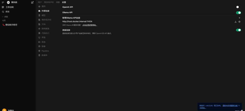 1、点击设置->选择外部连接:因为是本地部署,这里关闭了openAI API 功能选项,打开本地的Ollama API连接,配置连接地址:http://host.docker.internal:11434