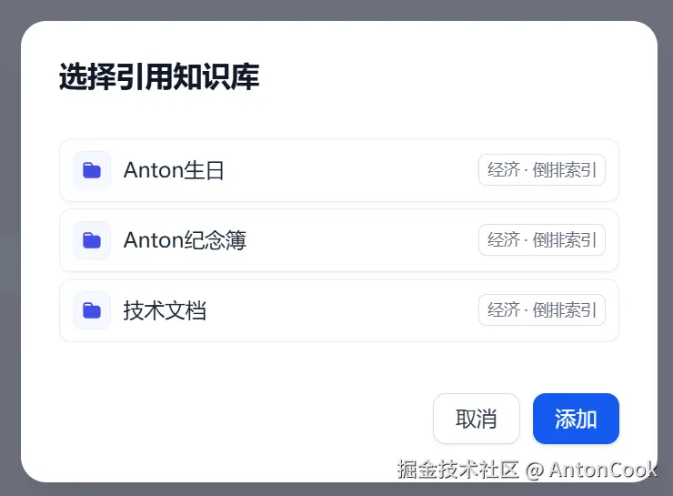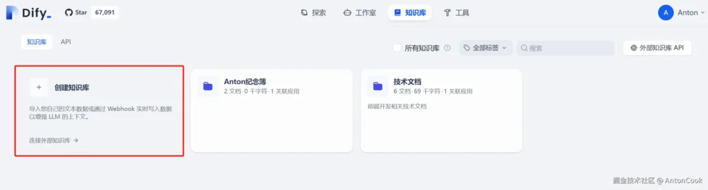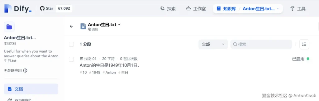 保存后,Dify集成的知识库处理模型会自动将文档内容进行向量处理,等待处理完成,前往知识库就能看到 Anton生日 知识库并使用了。