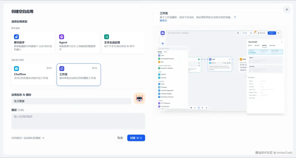 创建应用可以使用平台上公开的应用模板,一键复制即可再定制修改,这里我为了演示创建空白的应用,并选择工作流的形式。