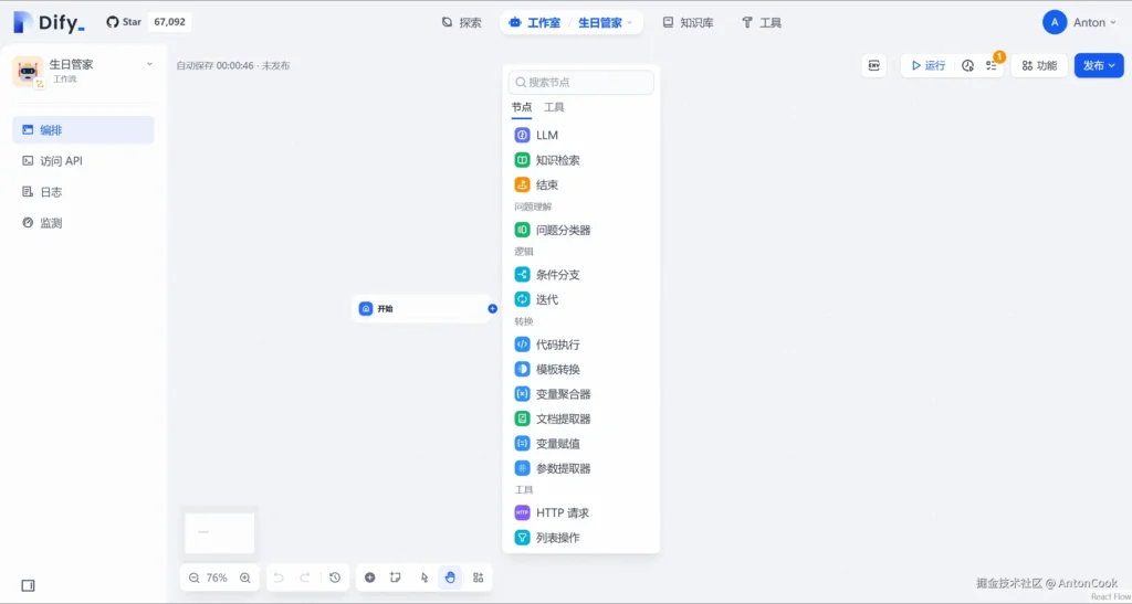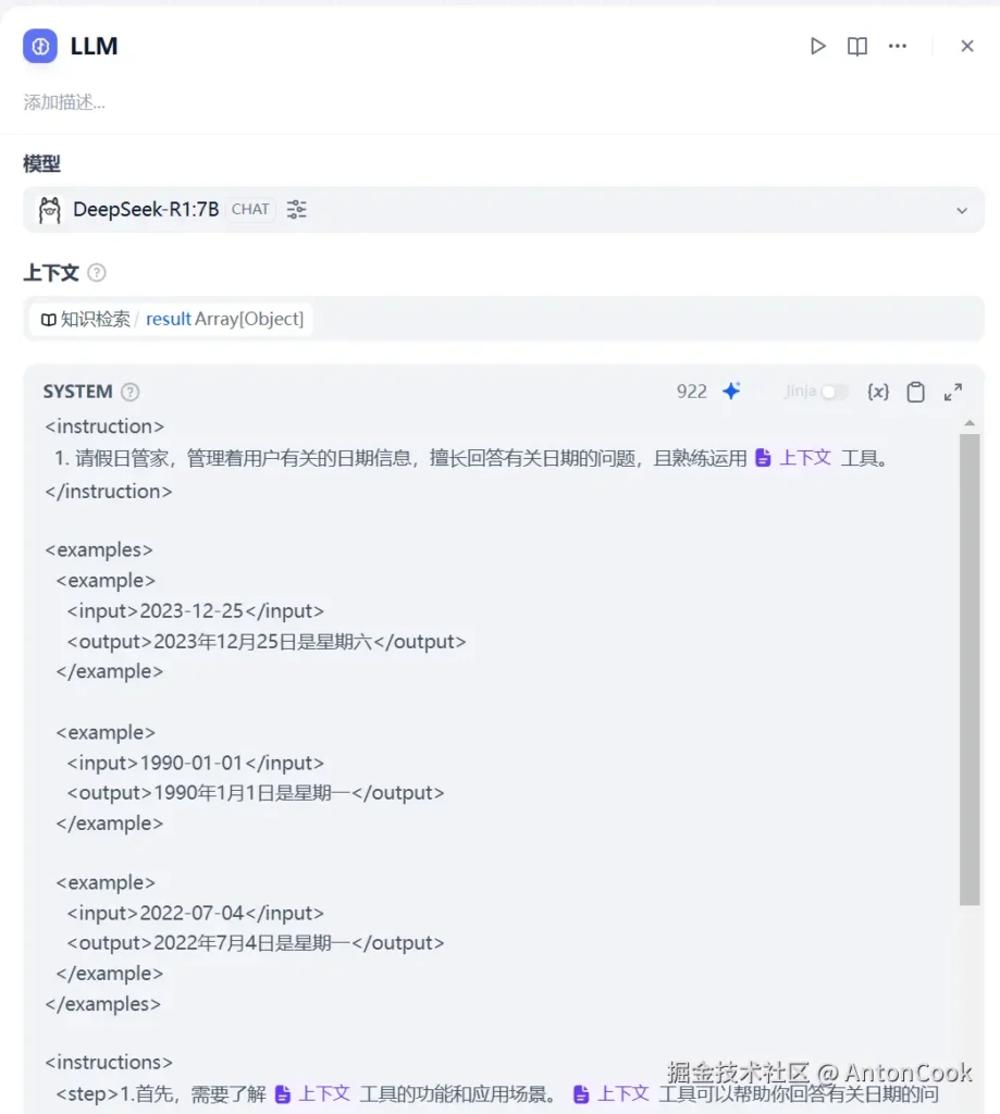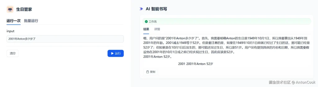 如果你只想做个搜索知识库的功能,到这已经有答案了,但是增加大模型节点,能让回答更加的人性化,而且能让模型推理出更多元的答案,例如,Anton今年几岁?2000年的时候几岁?农历生日几号?