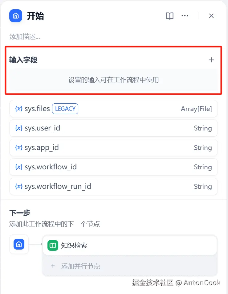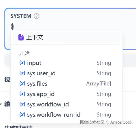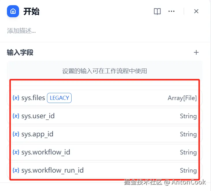 从开始节点的配置面板可以看到,节点本身具有一些系统环境变量,例如user_id、app_id、workflow_id这些字符可以在你需要针对用户,针对对话处理特殊逻辑时提供帮助。
