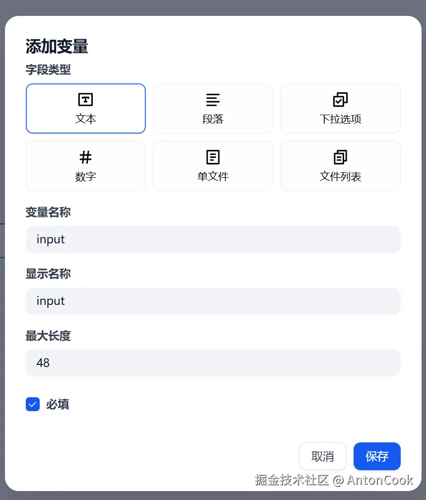 现在我们就需要增加一个字段,用来接收用户通过对话框发起的问题,这里创建一个 input 字段,用户的问题应该是一句文本,故而选择“文本”字段类型,且是必须输入的内容,勾选必填