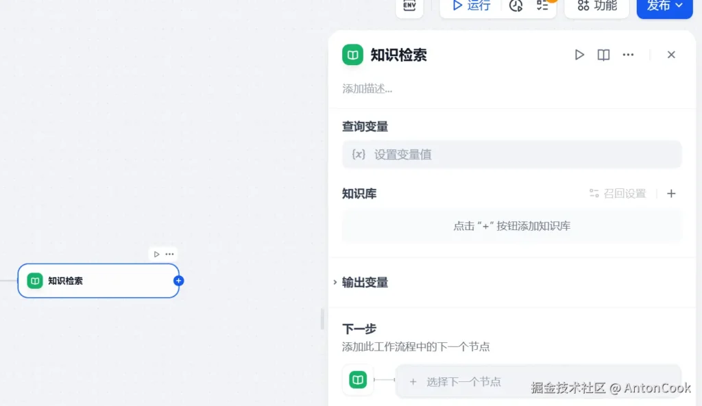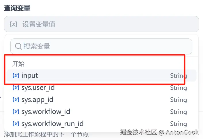 最后还要配置查询变量,也就是知识检索节点的输入变量,这里直接选择接收开始节点中,我们新增的input字段