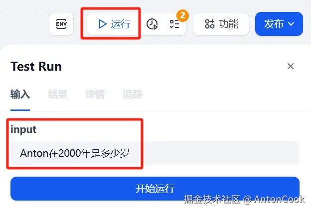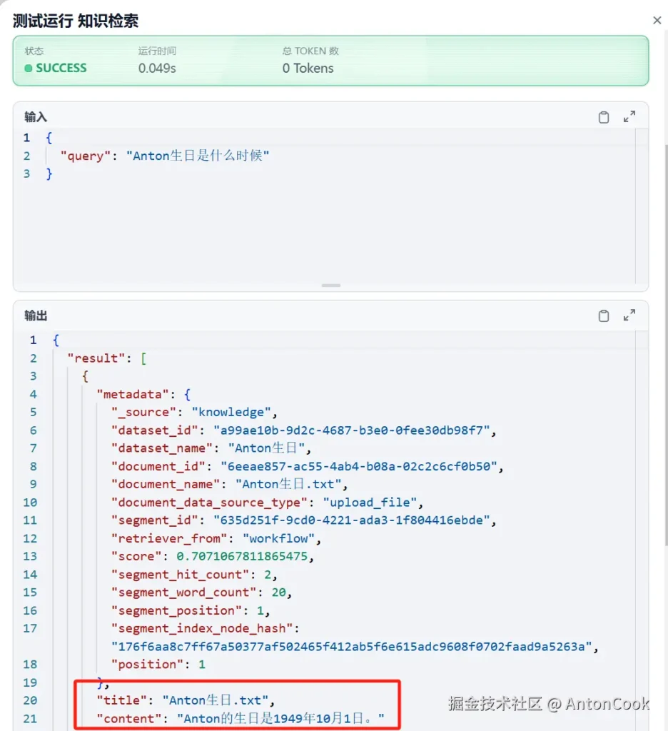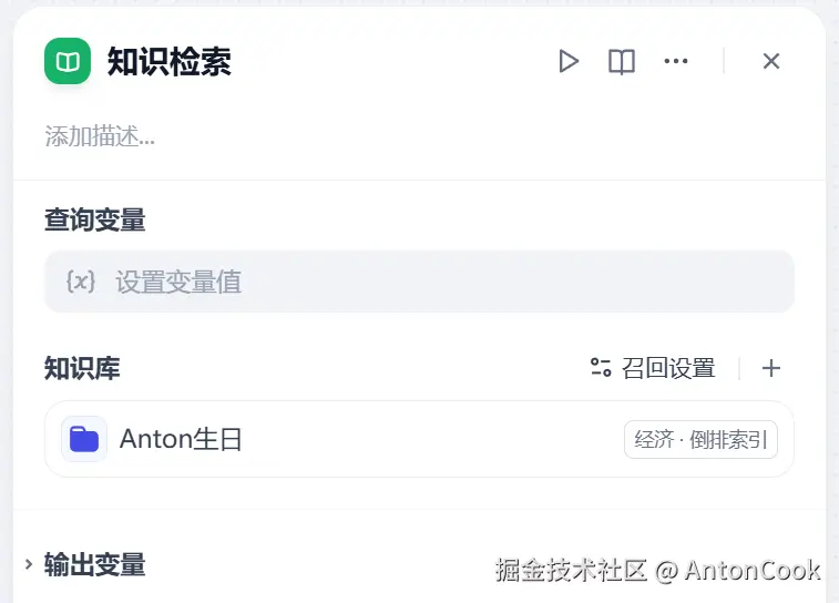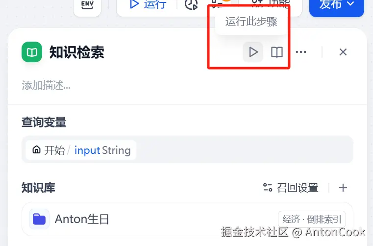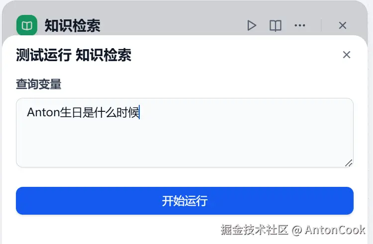 首先会需要提供该节点必须的查询变量,也就是input字段来提供节点测试,我们输入“Anton生日是什么时候”