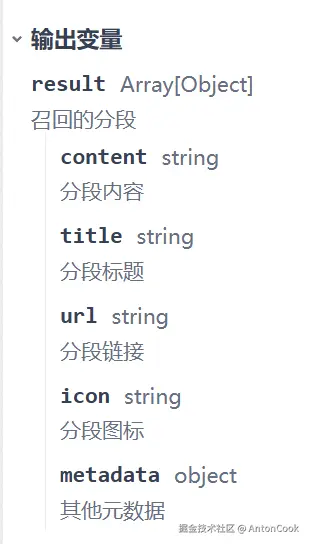 展开输出变量,可以看到知识库检索节点的输出格式,该节点的输出没法自定义,但这些字段已经足够使用