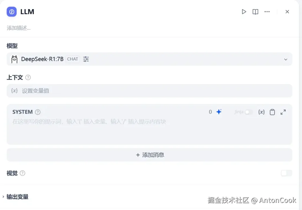 从LLM配置面板可以看到有模型的选择,上下文的配置,还有设置输出变量,甚至能开启视觉理解的能力,便可以发送图片来让AI解读