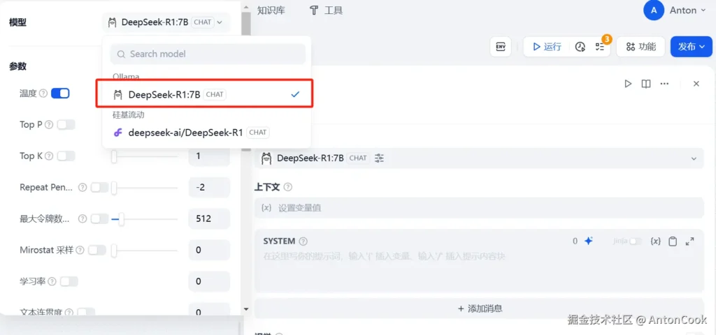 首先选择你想使用的AI模型,这里选择Ollama本地部署的DeepSeek-R1,能看到还有很多模型微调的参数可供调整,可以自行尝试。