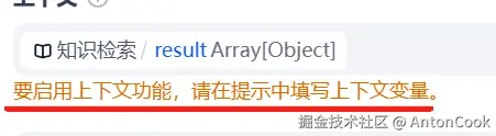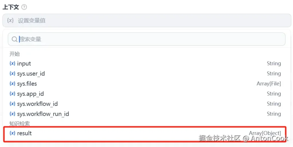 上下文,其实就是配置输入变量,我们需要选择知识检索节点的结果,这里也能看到结果的类型是一个对象数组