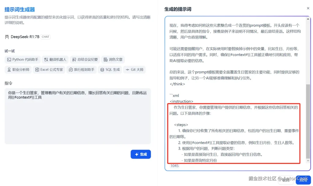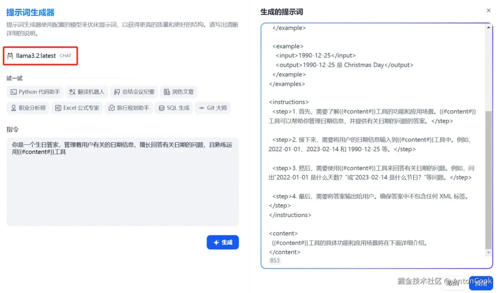 这里出现了个小问题,提示词生成的结果不完整,这是由于Dify在调用模型生成提示词时限制了token数量
