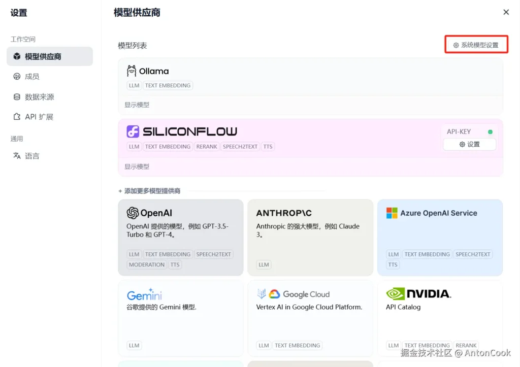 修改提示词生成的AI模型,需要前往“设置”-“模型供应商”,点击【系统模型设置】按钮修改