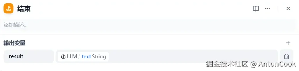 在配置面板中,增加输出变量,并选择LLM节点的text输出字段