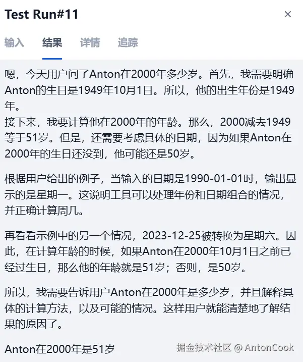 这次有了大模型,我们可以问一些需要推理的问题,例如:Anton在2000年是多少岁
