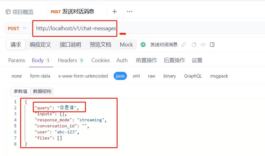 请求数据:其中query就是我们和大模型聊天时输入的文本。其他的参数建议大家根据需要对照官方文档。