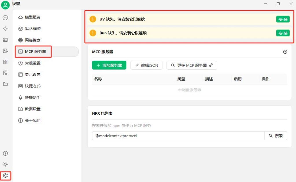 重启打开客户端后,点击设置-MCP服务器,可以看到需要安装UV与Bun环境: