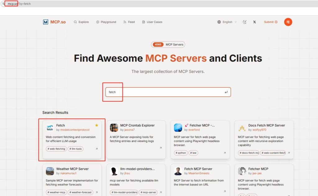 接下来我们可以访问这个网站来搜索一些MCP Server进行测试:https://mcp.so/