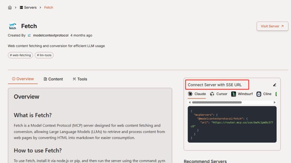 这里以fetch这个能让AI抓取网页内容的服务为例,点开它: