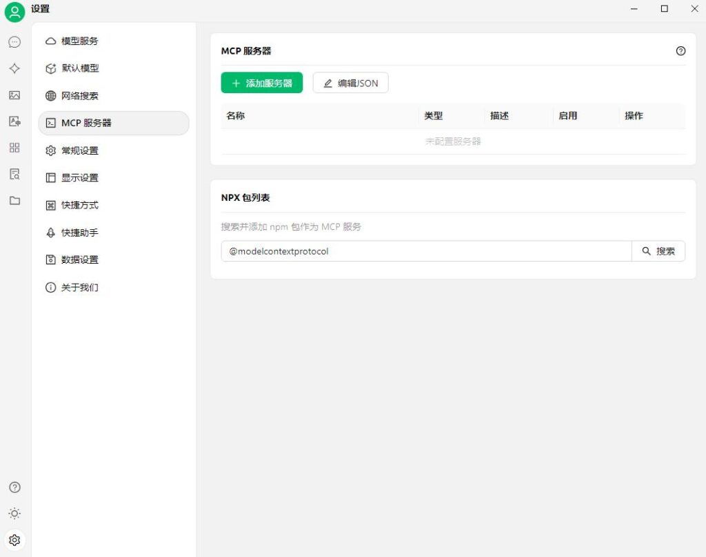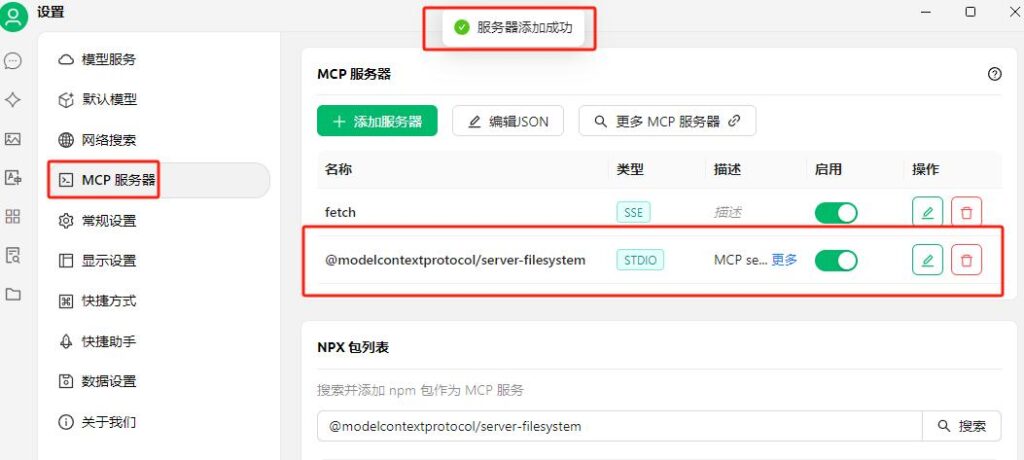 首先我们进入MCP服务配置,点击NPX包列表后边的搜索,输入@modelcontextprotocol/server-filesystem进行搜索,然后点击添加服务器: