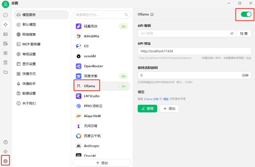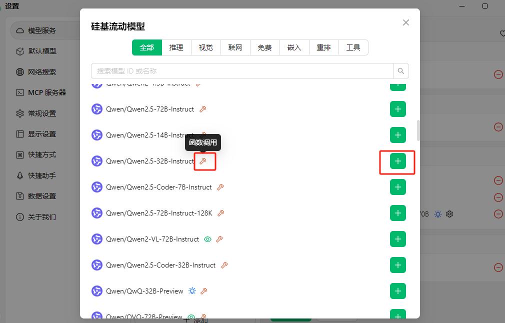 首先我们要在客户端设置中配置模型服务,拿硅基流动的模型服务进行举例,点击底部的管理按钮,能看到这里有几十种大模型可以调用,我们要选择模型名称后带扳手图标的,即支持函数调用的模型。