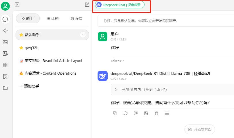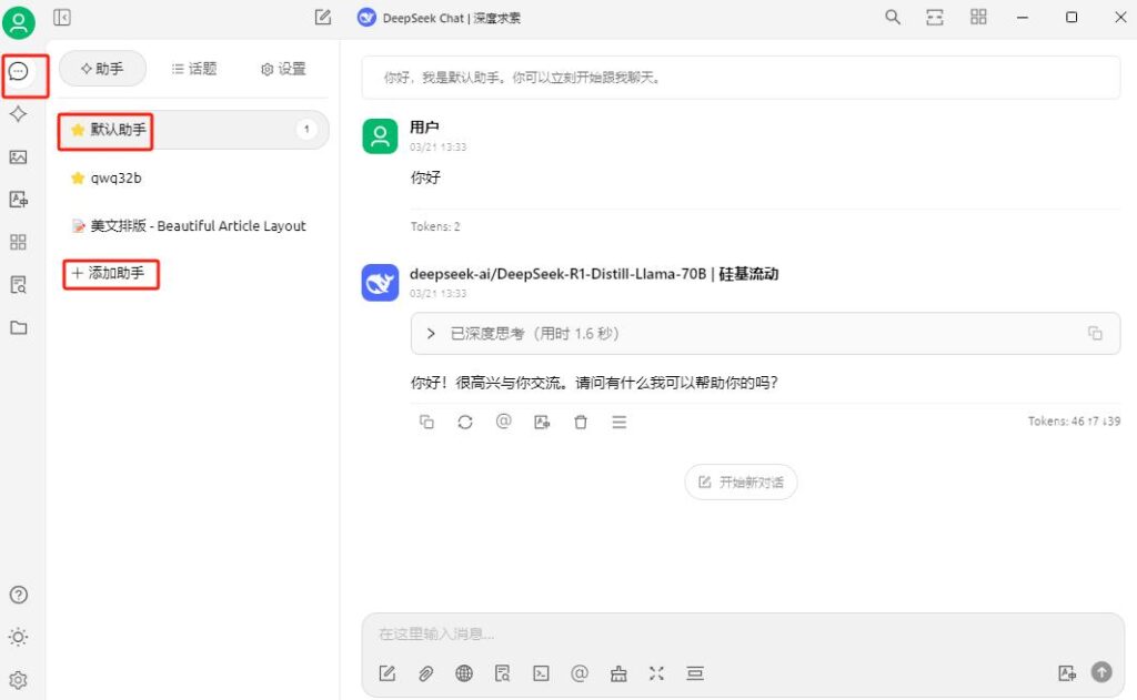 现在我们回到客户端首页,点击添加助手或者使用默认助手都可以: