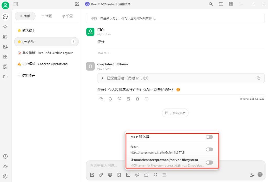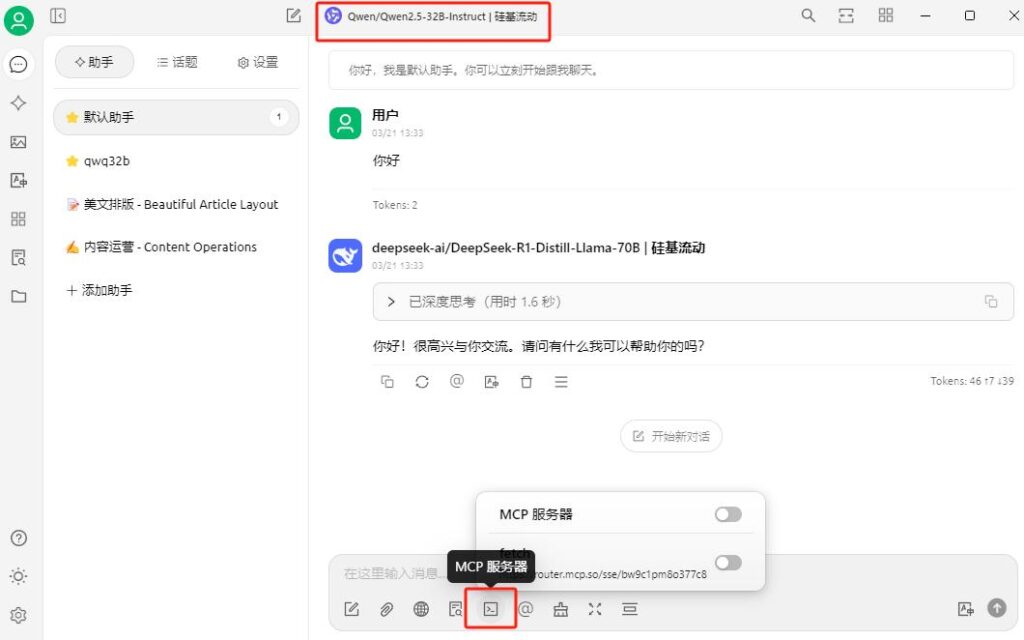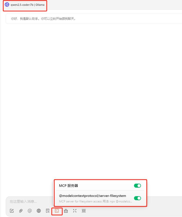 选择好模型后,在聊天框底部能看到MCP服务器图标和启动服务开关: