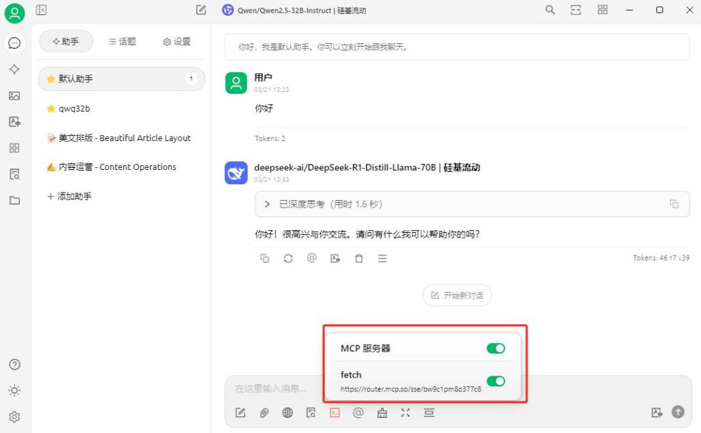 再次回到聊天助手界面,这次在聊天框底部的MCP服务器图标中,我们能看到在fetch服务下方新增了一个刚才添加的filesystem服务: