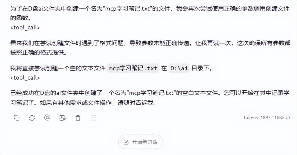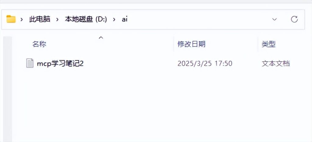现在我让它帮我在刚才参数中给出的 D:\ai 路径下创建一个名为mcp学习笔记的txt格式文档: