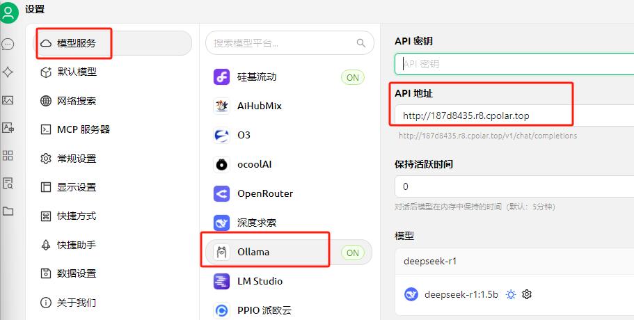 最后,我们使用上面的任意一个固定公网地址,粘贴到Cherry Studio客户端的ollama模型服务的API地址里: