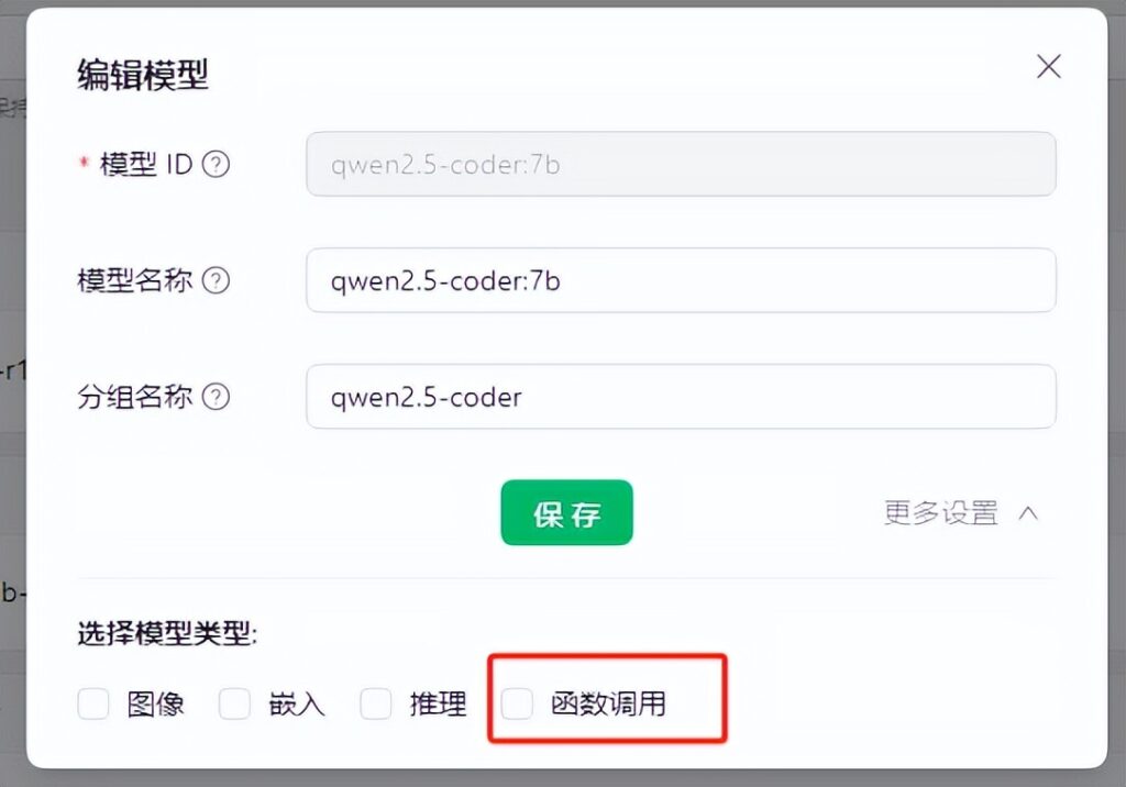 添加后,如果发现模型名称后边没有代表支持函数调用的扳手图标,我们可以点击添加后模型名称后的设置按钮,然后点击更多设置: