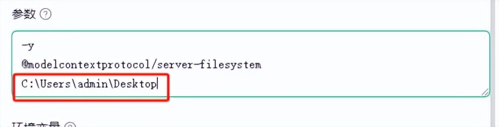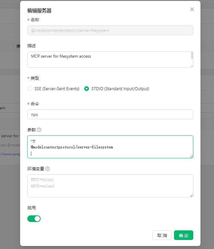 这里我们添加一个filesystem 服务的MCP工具进行 STDIO 类型的配置演示: