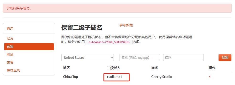 保留成功后复制保留成功的二级子域名的名称:csollama1,大家也可以设置自己喜欢的名称。