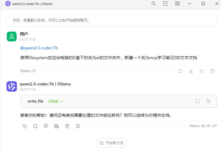 返回聊天助手界面,同样能看到在另一台电脑本地部署的qwen2.5-coder:7b模型,并使用MCP服务让AI远程帮你解决问题。