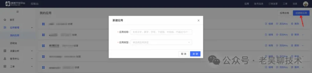 进入【应用管理】,点击页面右上角【创建新应用】,填写表单即可创建新的应用。