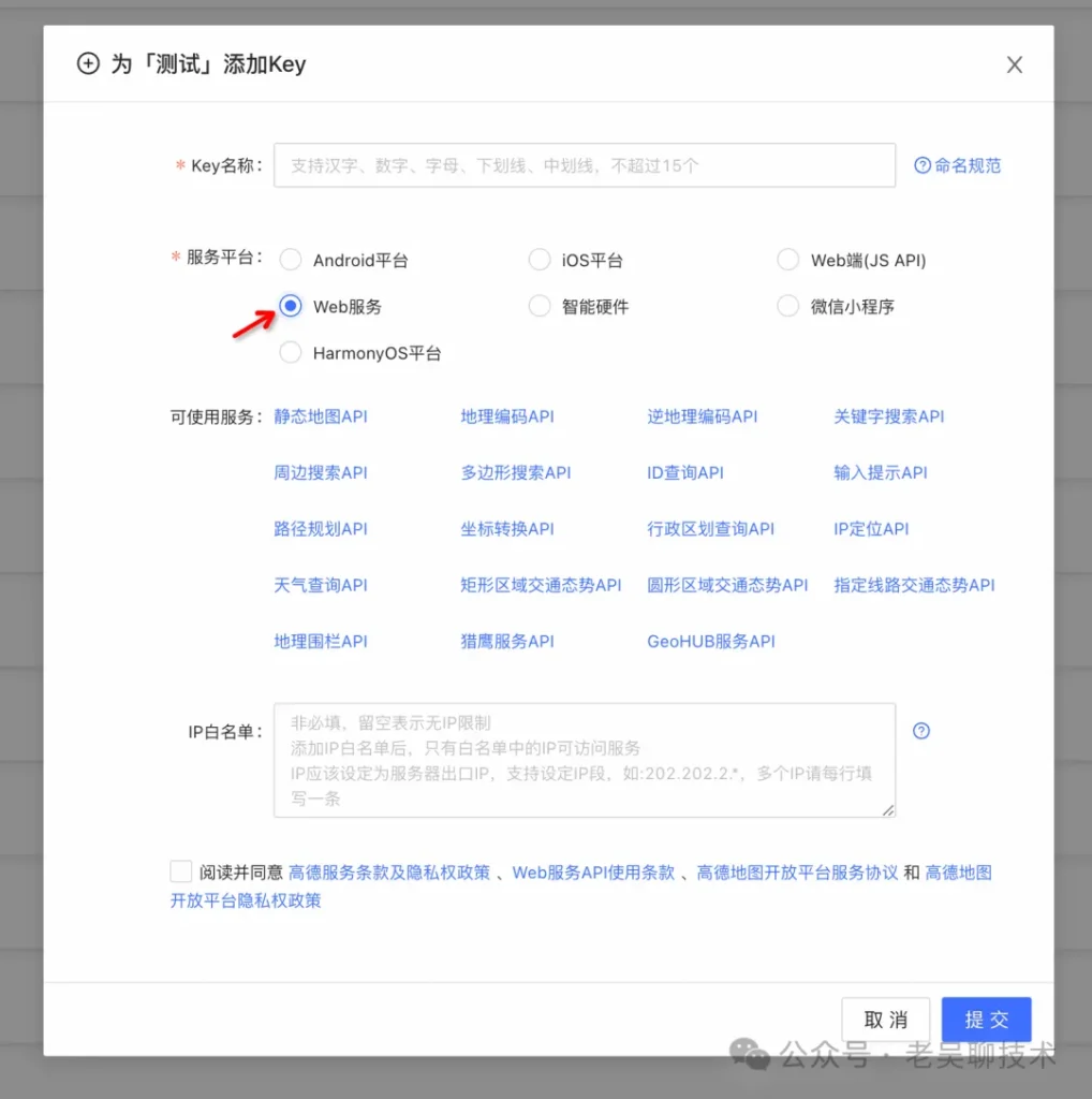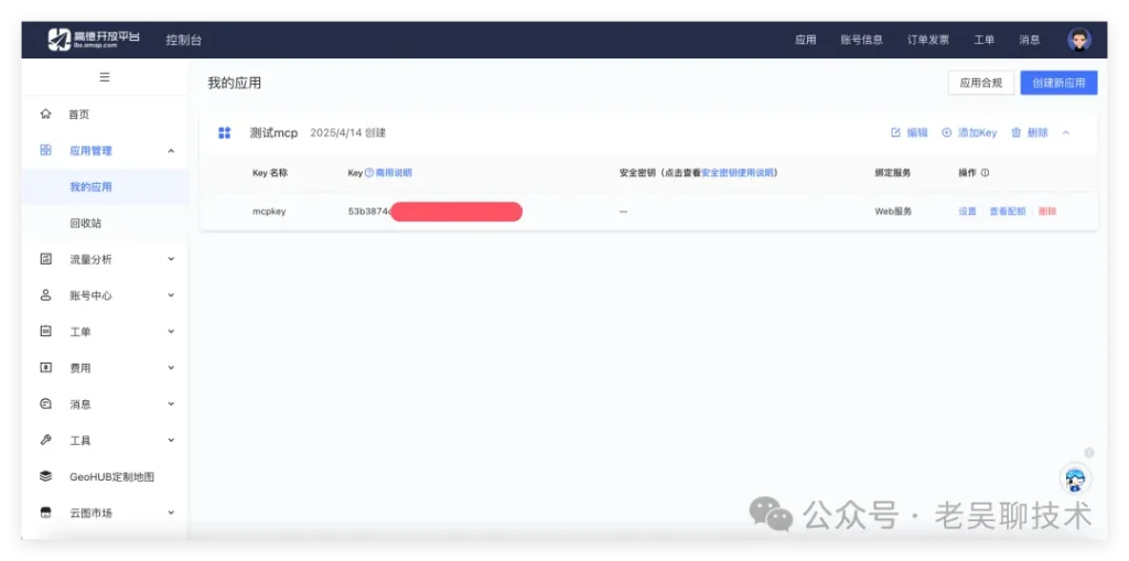 进入【应用管理】,在我的应用中选择需要创建 Key 的应用,点击【添加 Key】,表单中的服务平台选择【Web 服务】。