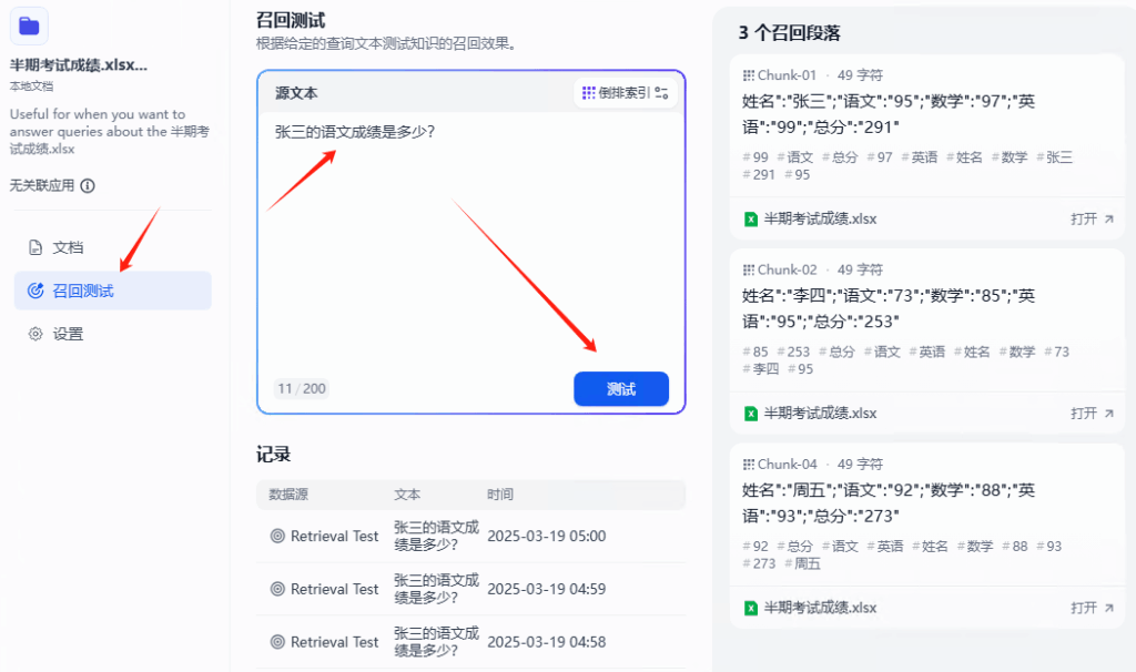 点击 召回测试,可以看到对应的段落,结果不是最准确的。因为这些结果,都包含了语文。