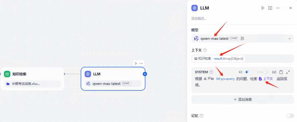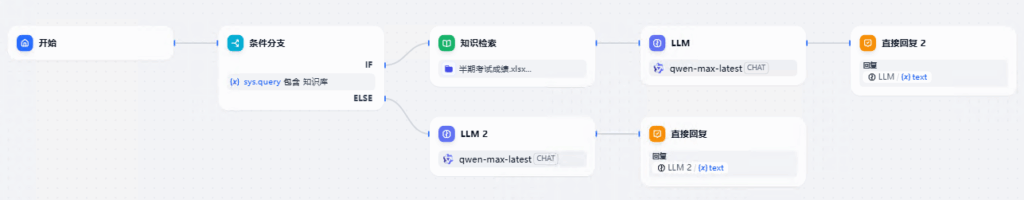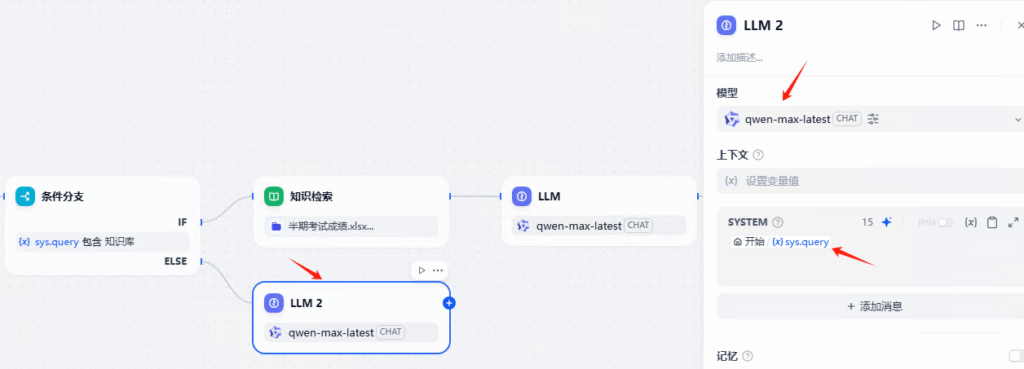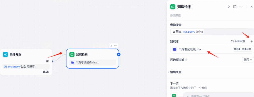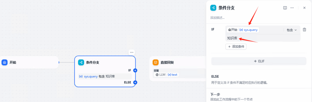 添加条件分支,sys.query包含知识库。 也就是聊天信息包含知识库关键字