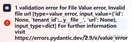 “1 validation error for File Value error, Invalid file url [type=value_error,input value={id: None,’tenant id’..y_file_,’url’:None), input type=dict] For further information visit https://errors.pydantic.dev/2.9/v/value_error”