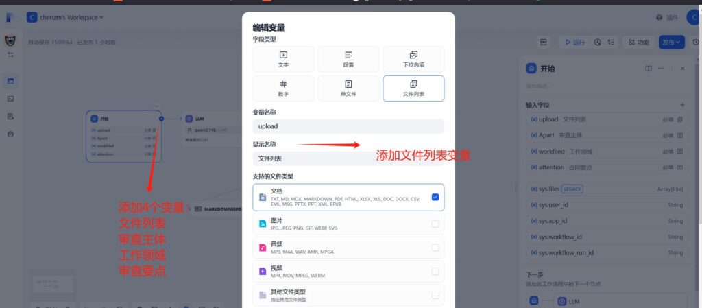 开始节点设置好了4个变量,添加下一个节点,节点类型:LLM
